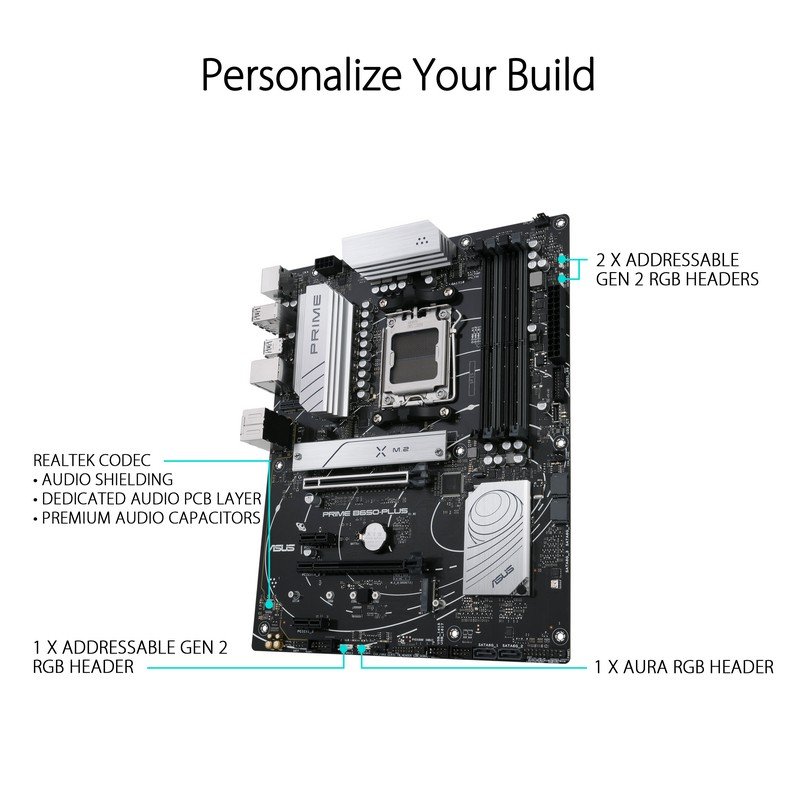 Las placas base de la serie ASUS Prime están diseñadas por expertos para liberar todo el potencial de los procesadores de la serie AMD Ryzen 7000. Con un diseño de alimentación robusto, soluciones de refrigeración integrales y opciones de ajuste inteligentes, PRIME B650-PLUS ofrece a los usuarios y a los constructores de PC una gama de optimizaciones de rendimiento a través de funciones intuitivas de software y firmware.