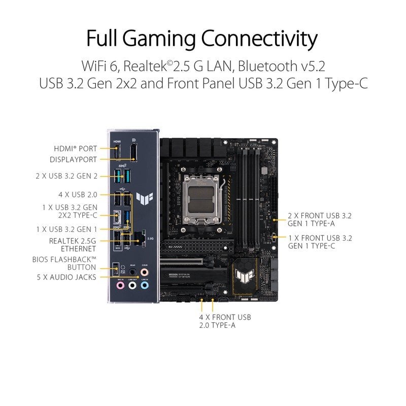 ASUS TUF GAMING B650M-PLUS toma todos los elementos esenciales de los últimos procesadores de la serie AMD Ryzen 7000 y los combina con funciones listas para jugar y durabilidad comprobada. Diseñada con componentes de grado militar, una solución de alimentación mejorada y un sistema de refrigeración integral, esta placa base supera las expectativas con un rendimiento sólido y estable para juegos de maratón.