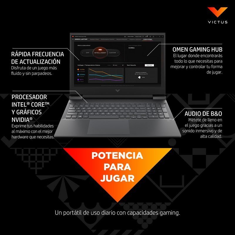 Gracias a un procesador Intel® Core?, el portátil Victus by HP de 16,1 pulgadas cuenta con todas las características que necesitas para jugar y utilizarlo en tu día a día. Consigue más flexibilidad al jugar con un teclado gaming polivalente y disfruta de una pantalla con frecuencia de actualización y sin tearing. Supera el acaloramiento de cada partida gracias a un sistema de refrigeración que evita el sobrecalentamiento. Gana experiencia de juego más allá de tu hardware con OMEN Gaming Hub.