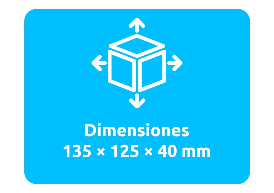 - Dimensiones: 135 × 125 × 40 mm | Peso neto: 0.6 kg