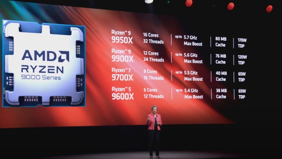 La CEO de AMD ha comenzado hablando del Ryzen 9 9950X como el modelo más potente de esta familia, incluso lo ha enseñado frente a las cámaras. Dispone de 16 núcleos, 32 hilos y hasta 5.67 GHz con 80 MB de caché total dentro de 170W de TDP. La han anunciado como la CPU doméstica más rápida del mundo.