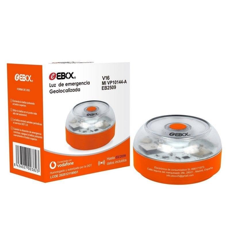 Maximiza tu seguridad en carretera con la baliza V16 Ebox MI VP10144-A, homologada DGT y conectada, para emergencias con geolocalización instantánea.