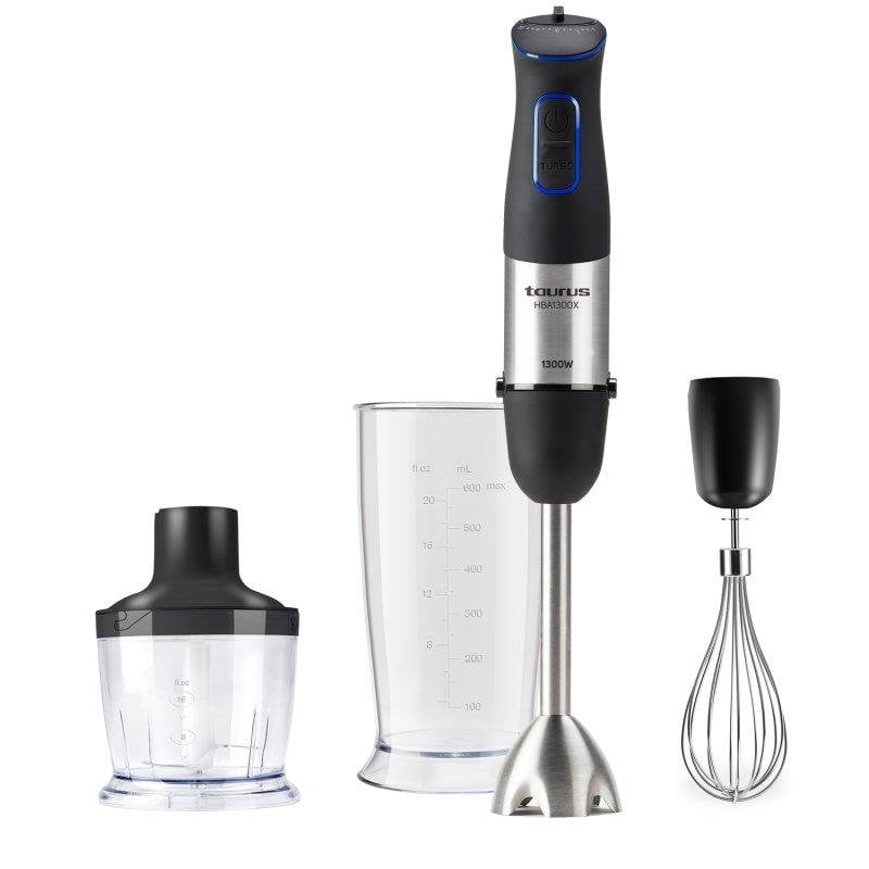 Crea texturas homogéneas al instante con la batidora de mano Taurus HBA1300X de 1300W, incluye kit completo de accesorios.