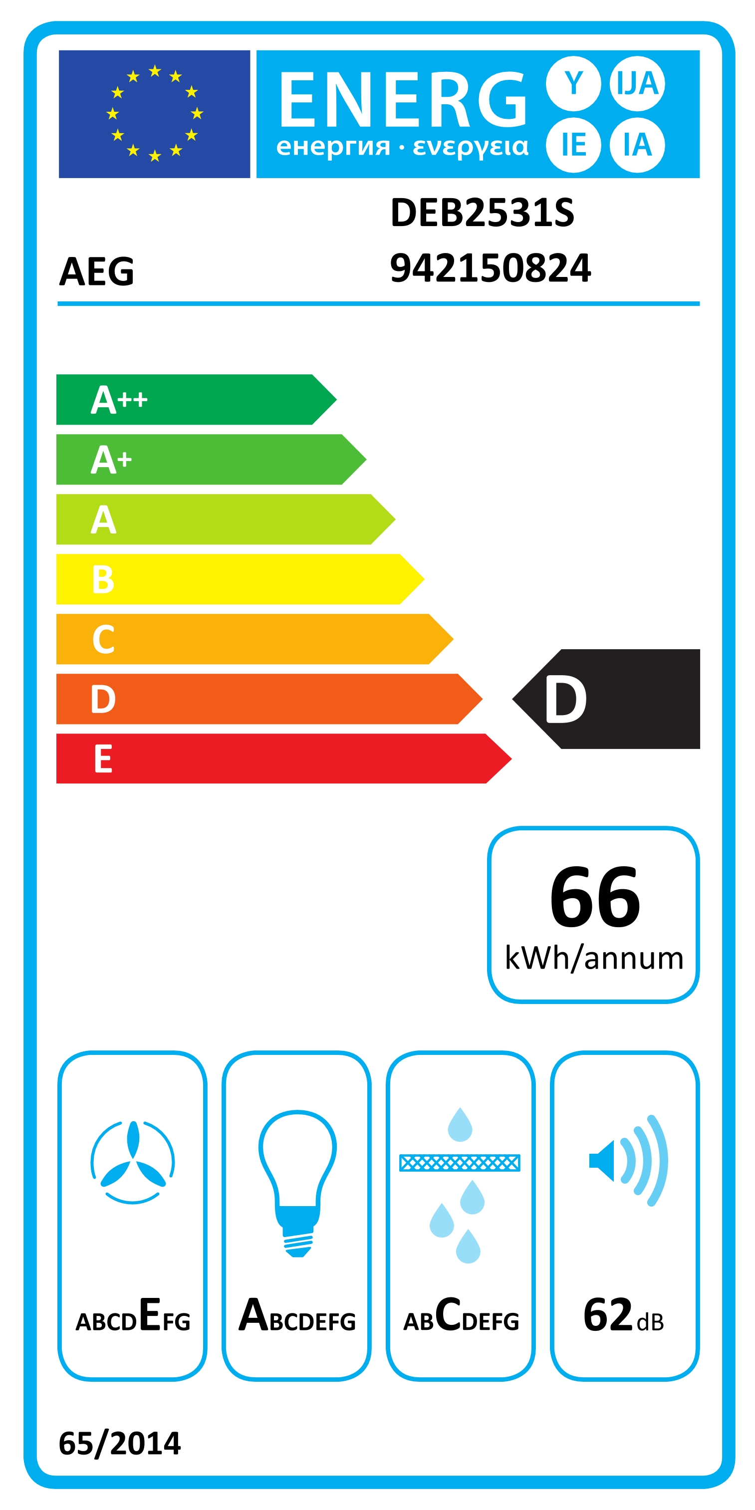 Cuenta con una clasificación energética D en una escala de A++ a E, con un consumo anual de 66,3 kWh, equilibrando potencia y eficiencia.