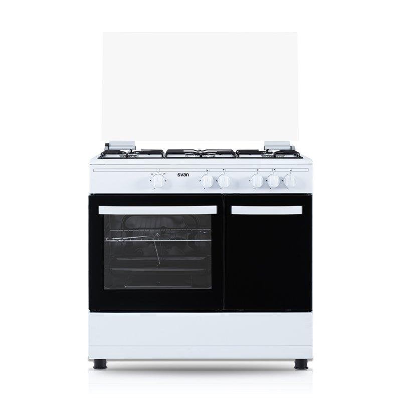 La cocina de gas Svan SKGW5901PB ofrece potencia y seguridad con 5 quemadores y horno de 55L para una experiencia culinaria profesional y eficiente.