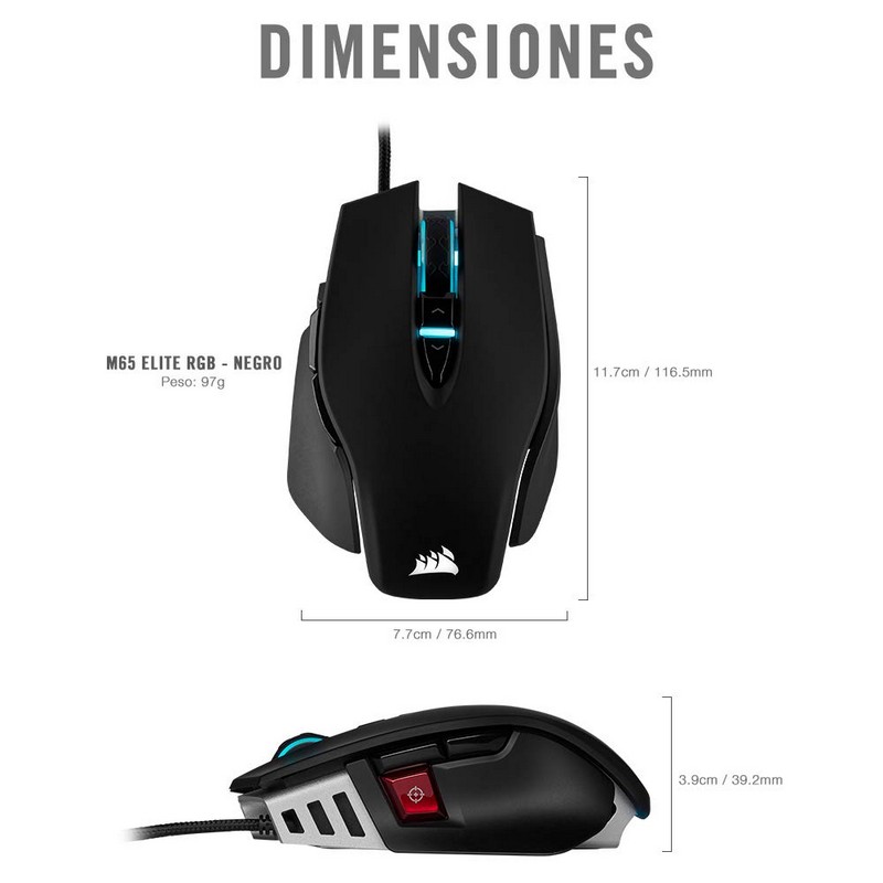 El modelo M65 RGB ELITE es un ratón para juegos FPS de competición con la tecnología que buscas para ganar, la flexibilidad para hacerlo tuyo y una calidad en el diseño para durar. El sensor de alta precisión de 18 000 DPI proporciona un rastreo de precisión píxel a píxel y la posibilidad de una calibración avanzada de superficie y, gracias a la estructura de aluminio de calidad aeroespacial, es ligero y muy resistente.