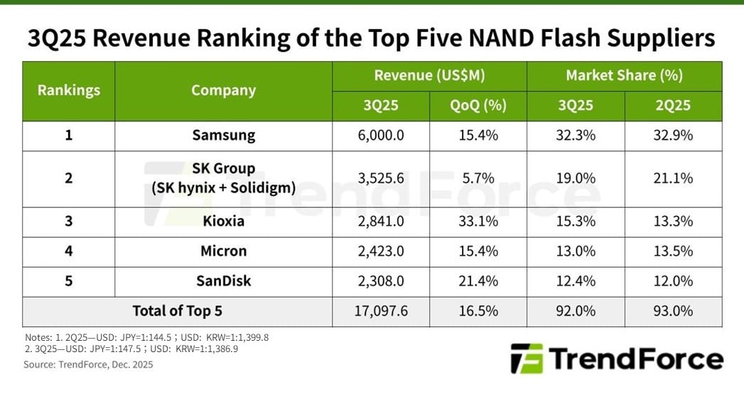 La cosa cambia en el mercado de SSDs, ya que Micron no es uno del TOP 3 fabricantes del mundo. Según TrendForce, Samsung es el primero con un 32.3%, SK Group (SK hynix + Solidigm) tiene el 19% y el tercer puesto es para Kioxia con un 15.3%.