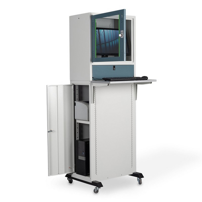 - El armario móvil para equipos informáticos tiene una capacidad de carga de 200 kg y un grado de protección IP20; la unidad de pantalla se cierra con una puerta de cristal de seguridad con marco metálico
