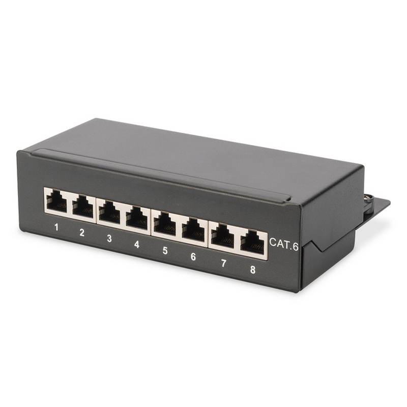 - Panel de conexión DIGITUS de escritorio CAT6, apantallado Clase E, 8 puertos RJ45, 8P8C, LSA, Color negro RAL 9005