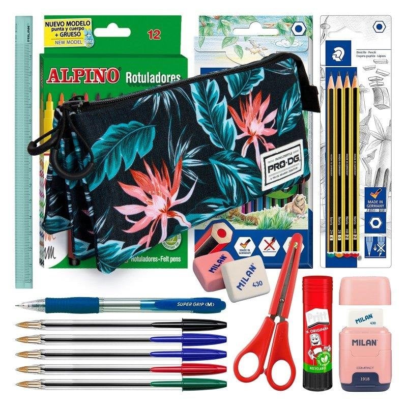 Contenido de la cajaEstuche, 4 lápices STAEDTLER, 12 lápices de colores STAEDTLER, 12 rotuladores ALPINO, 5 bolígrafos BIC, 1 bolígrafo PILOT, 1 afilaborra MILAN, 2 gomas MILAN, 1 tijeras MILAN, 1 barra de pegamento PRITT, 1 regla triangular MILAN, tarjeta horaria