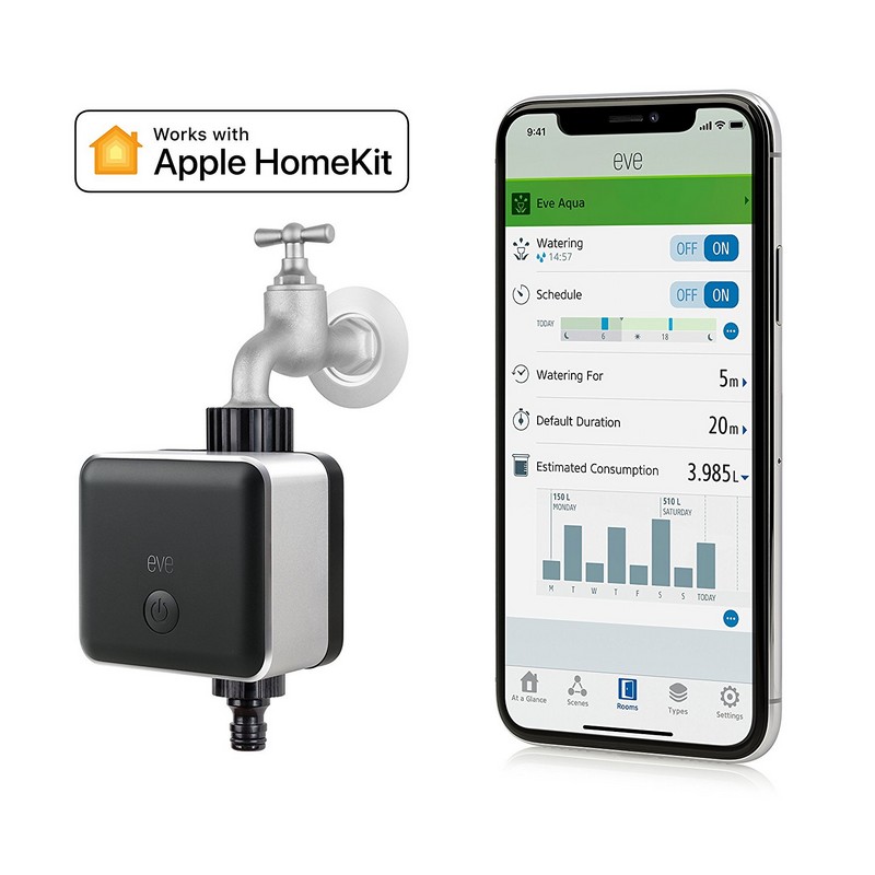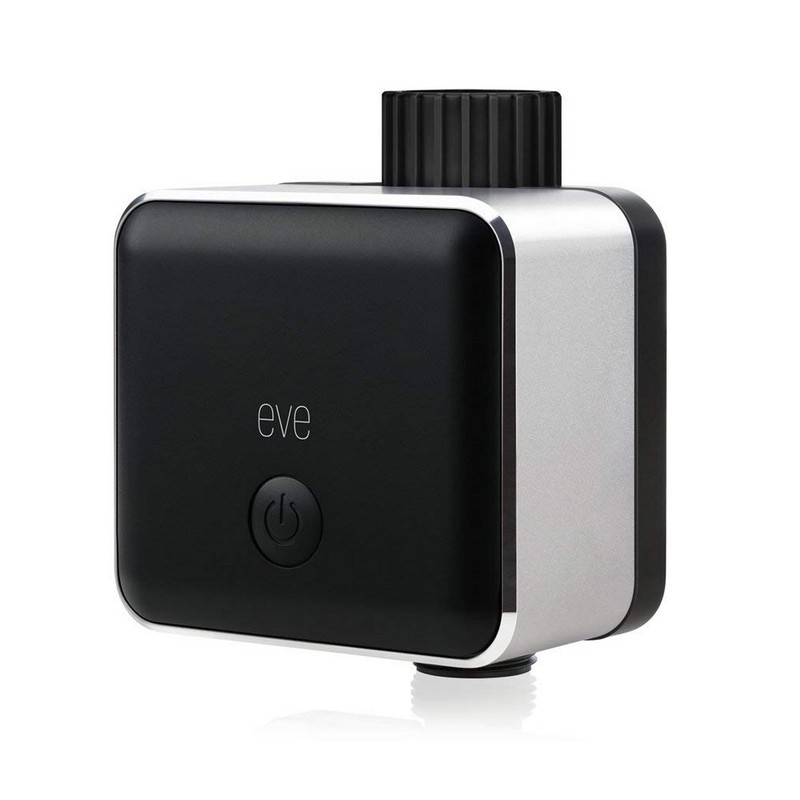 Controlador inteligente de riego. Con tecnología Apple HomeKit, temporizador y contador de consumo. Haz que tu dispositivo de riego se encienda solo justo cuando lo necesitas. O activa el riego desde cualquier lugar y deja que funcione solo. Eve Aqua convierte tu grifo exterior en un punto de riego inteligente. Tu jardín se mantendrá verde, casi sin esfuerzo.