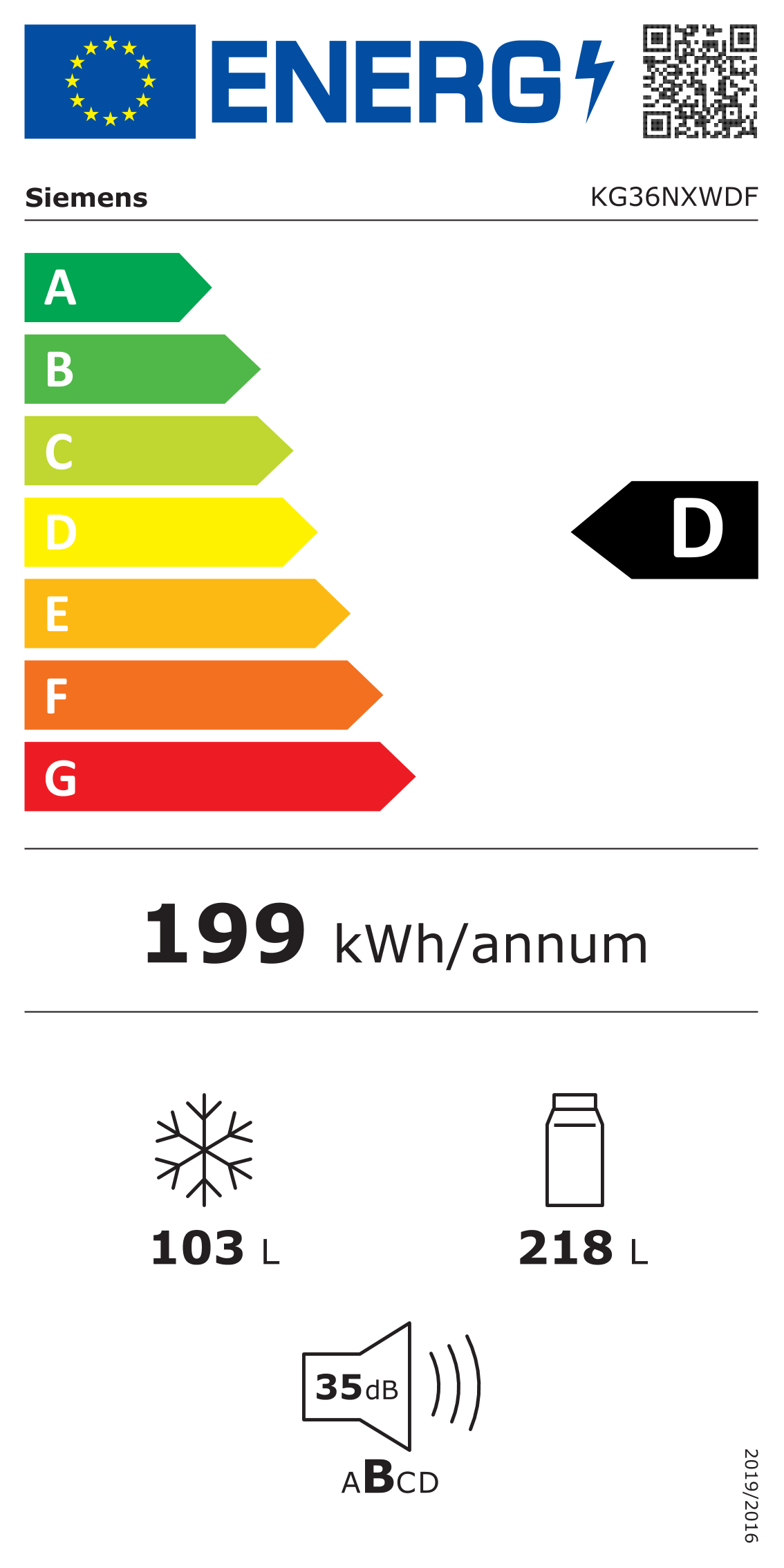 Eficiencia energética y bajo ruido. Clase D con un consumo anual de 199 kWh y nivel sonoro de solo 35 dB (clase B), ideal para entornos domésticos donde el silencio es fundamental, garantizando un funcionamiento eficiente y discreto.