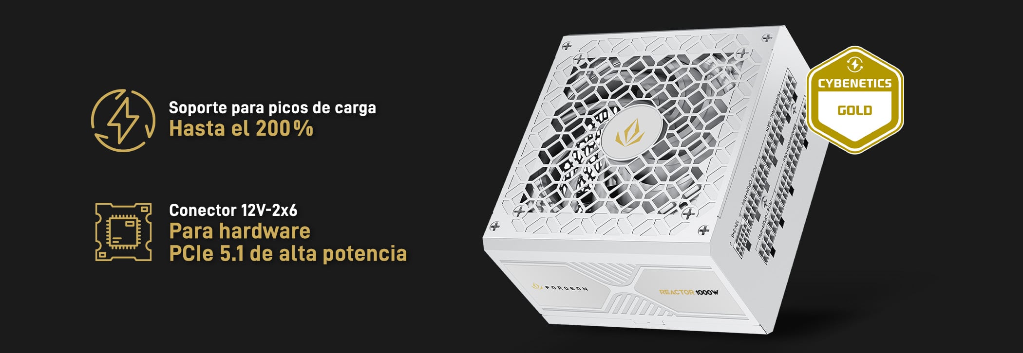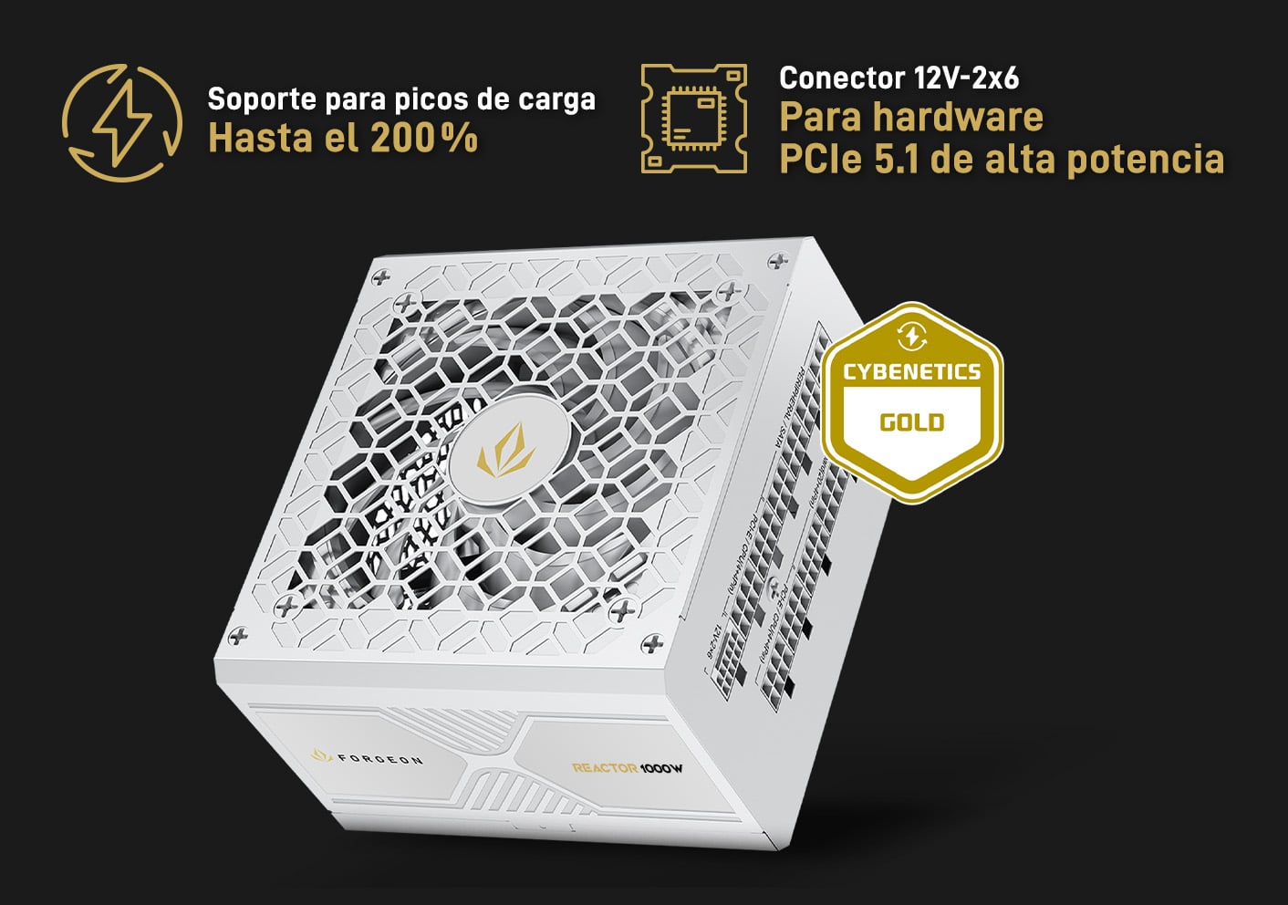 - La Forgeon Reactor 1000W está diseñada para alimentar sin esfuerzo los sistemas más potentes y exigentes. Con certificación Cybenetics Gold y compatibilidad con el estándar ATX 3.1, soporta picos de carga de hasta el 200 % de su potencia nominal e incorpora conector 12V-2x6 PCIe 5.1, preparado para las tarjetas gráficas de última generación.