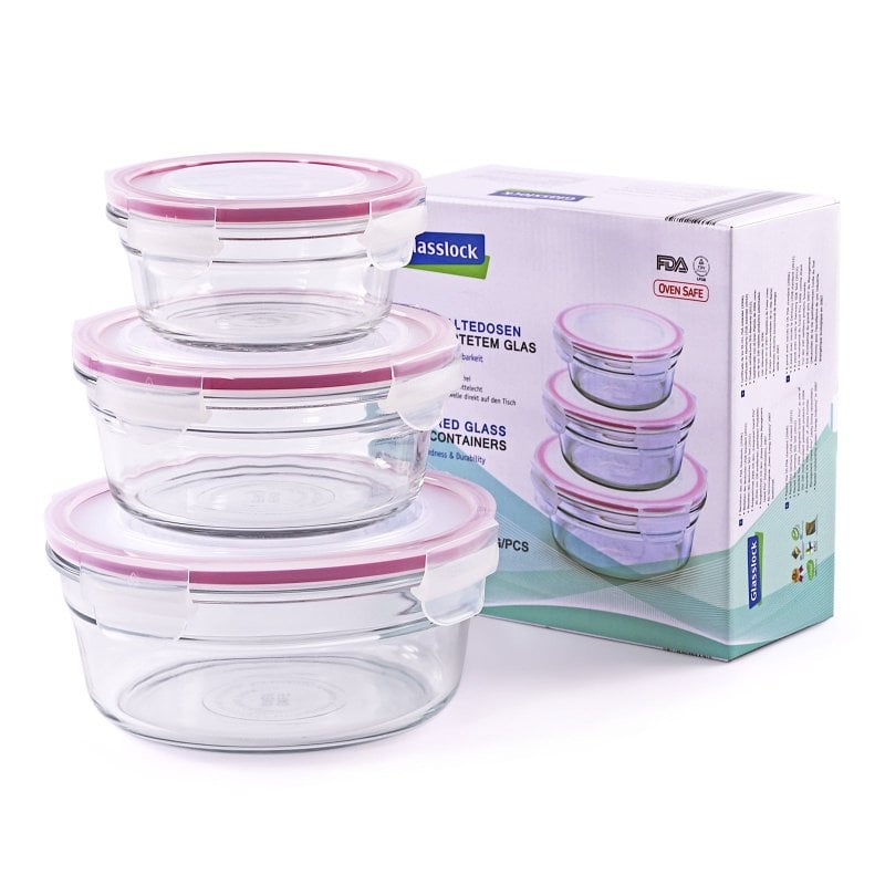 Glasslock Oven Safe - Lote De 3 Recipientes Redondos De 0.4l, 0.9l Y 1.5l En Vidrio Apto Horno