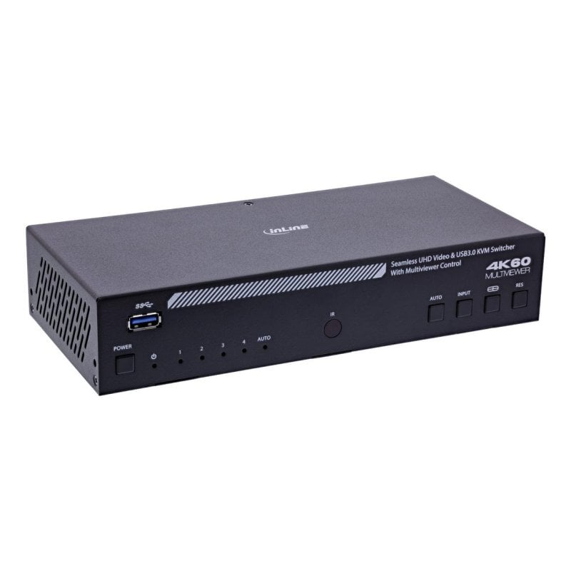 Controla hasta cuatro dispositivos HDMI en una sola pantalla con este interruptor KVM 4K Ultra HD, ideal para entornos profesionales y de control.
