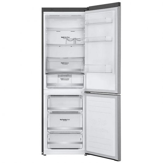 Frigorífico combi LG GBB71PZDMN con una altura de 1,86 metros, clase energética E, una capacidad neta total de 374 litros y acabado en acero inoxidable antihuellas.