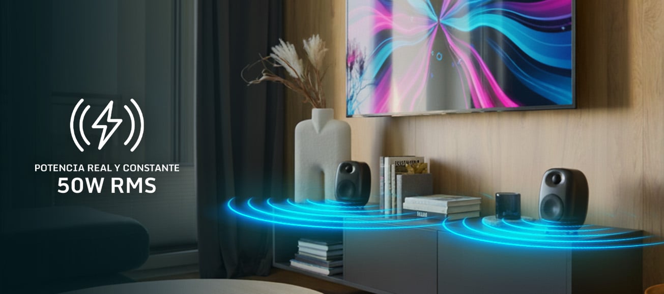 - Potencia real de 50W RMS, perfecta para un sonido equilibrado y envolvente en espacios domésticos