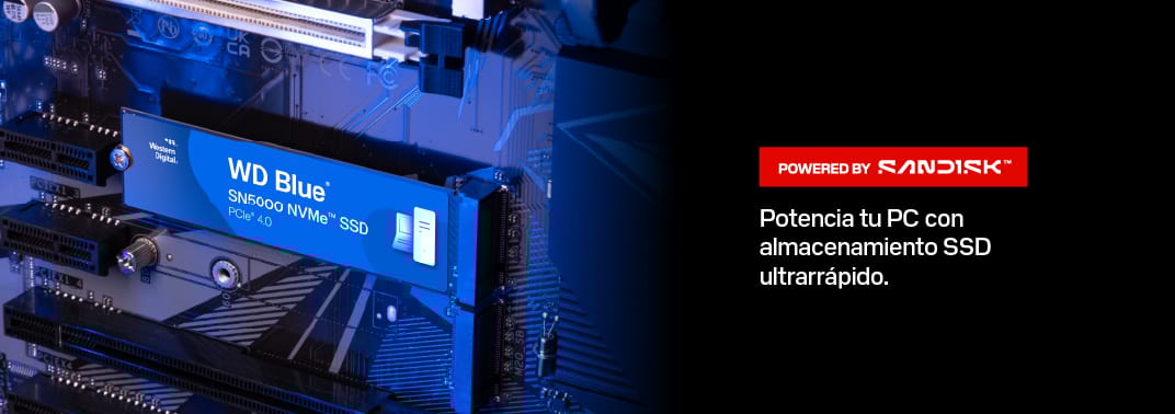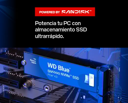 - Disco duro: WD Blue SN5000 POWERED BY SANDISK NVMe SSD 500GB 5000 MB/S PCIe 4.0 M.2 Gen4