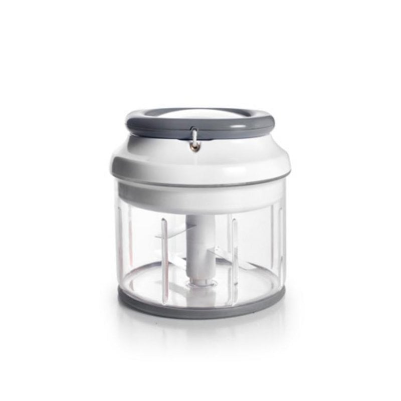El acabado en gris, transparente y blanco proporciona una estética moderna y elegante, adecuada para cualquier entorno tecnológico o gastronómico. Esta picadora manual integra funcionalidad e innovación para maximizar la productividad en la preparación de alimentos.