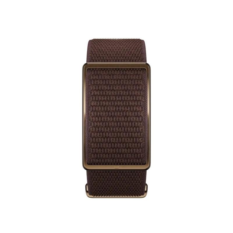 Diseño robusto y elegante. Fabricada en acero inoxidable y correa de tela marrón ajustable, combina resistencia y comodidad para uso diario o deportivo. Su formato rectangular y peso ligero (29 g) la hacen discreta y ergonómica, adaptándose a cualquier muñeca.