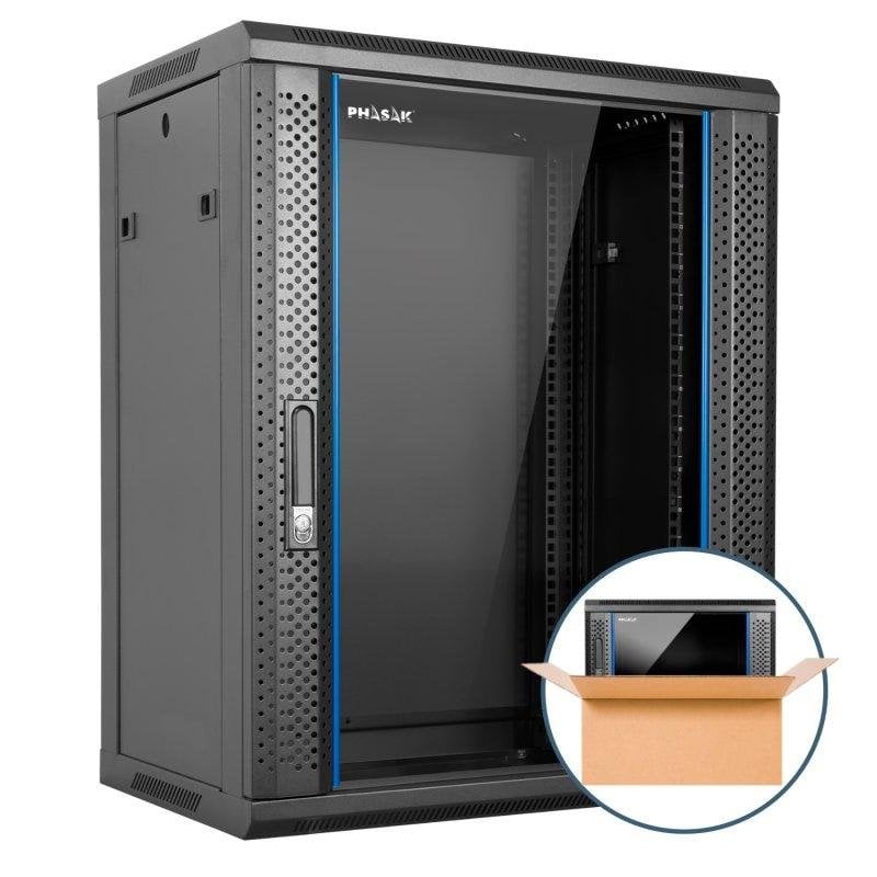 Rack mural Phasak Pro 15U 600x450 premontado con puerta de vidrio templado