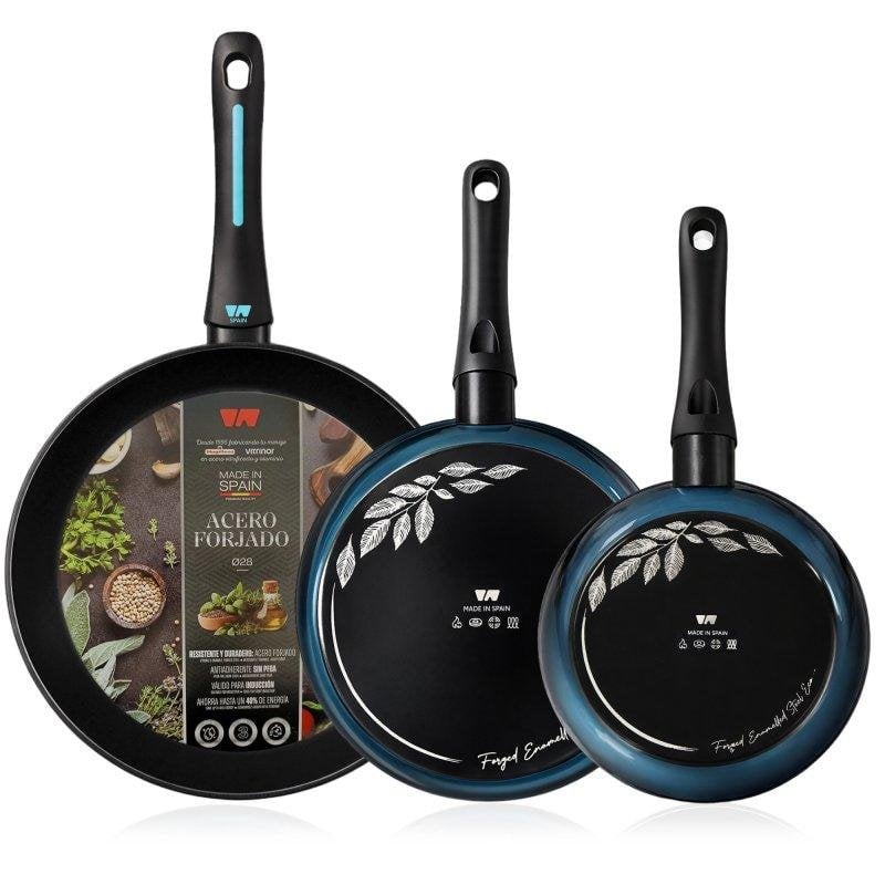 Set 3 Sartenes Inducción Acero Forjado 20-24-28cm antiadherente Sin PFOA, Fabricada En España, Briebe, Mare, Azul