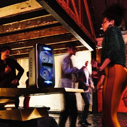 - Con asas integradas para facilitar el transporte: Llévatelo de fiesta a todas partes. Tanto si has quedado con tus amigos en casa como si llevas la fiesta contigo, el diseño compacto cúbico del GTK-XB72 incorpora un asa a cada lado para transportarlo fácilmente.