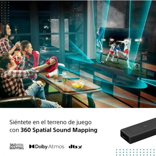 • Nuestra revolucionaria tecnología 360 Spatial Sound Mapping con los altavoces traseros de Sony crea varios altavoces virtuales a partir de una sola barra de sonido y los altavoces traseros. Gracias a los diversos altavoces virtuales dispuestos a tu alrededor en el campo sonoro óptimo para tu espacio, se trata de una nueva sensación de sonido. Disfruta de todo el drama de las tecnologías Dolby Atmos® y DTS:X®, y escucha cada respiración, paso y palabra como si estuvieras dentro de la peli.