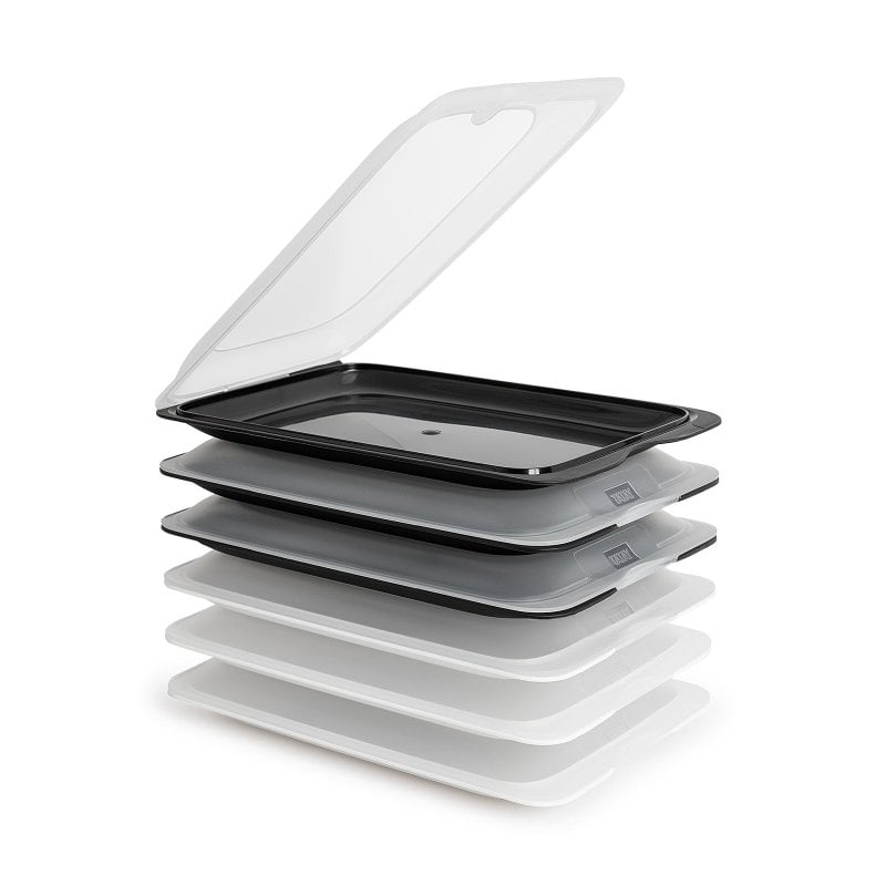 Cuentan con una tapa extraíble que te permite usar el recipiente también como bandeja para servir. De ésta manera, únicamente tendrás que sacarlo de la nevera, ponerlo en la mesa sin necesidad de usar otro plato, y una vez terminado, volver a guardarlo en la nevera con la tapa puesta.