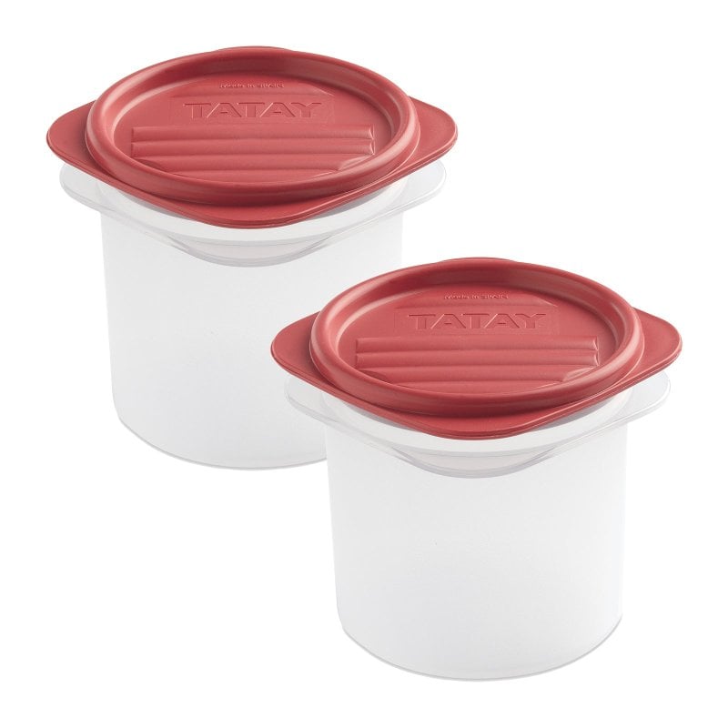 Pack 2X recipientes cilíndricos TATAY Top Flex de 0.3L fabricados en plástico polipropileno con cierre hermético a presión, muy resistente y fácil de limpiar. La tapa es flexible y está diseñada para que los recipientes sean apilables entre sí.