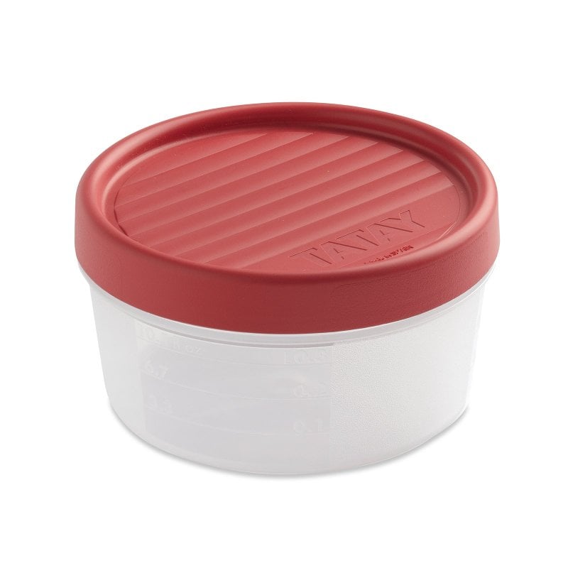 Set de 4 recipientes redondos TATAY Twist de 0.5L fabricados en plástico polipropileno con cierre hermético a rosca, muy resistentes y fáciles de limpiar. La tapa está diseñada para que los recipientes sean apilables entre sí.