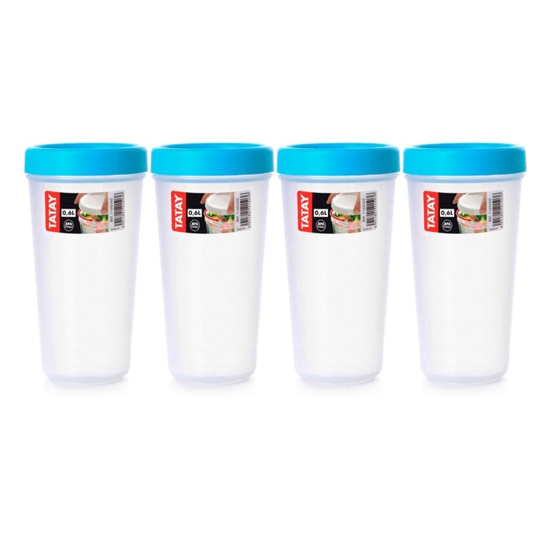 Set de 4 recipientes redondos TATAY Twist de 0.6L fabricados en plástico polipropileno con cierre hermético a rosca, muy resistentes y fáciles de limpiar. La tapa está diseñada para que los recipientes sean apilables entre sí.
