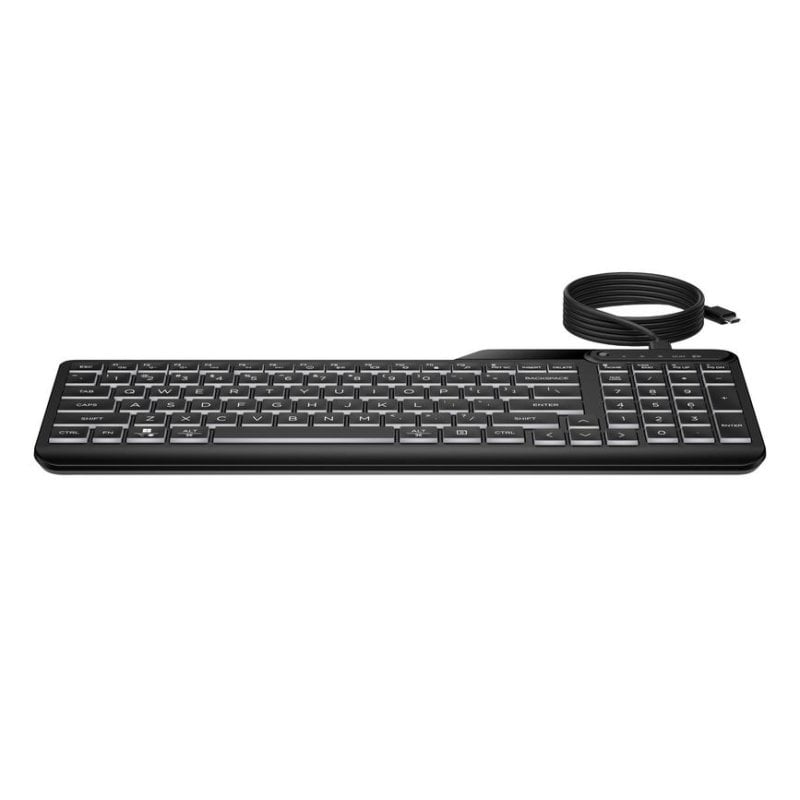 Productividad optimizada y entorno ergonómico. El HP 400 destaca por su perfil fino, teclas de membrana de pulsación silenciosa y retroiluminación LED blanca cálida de tres niveles, que permite trabajar sin esfuerzo incluso en entornos con baja luz. El layout completo en español (ES QWERTY) incluye teclado numérico y teclas de función dedicadas que facilitan el flujo de trabajo de usuarios avanzados.