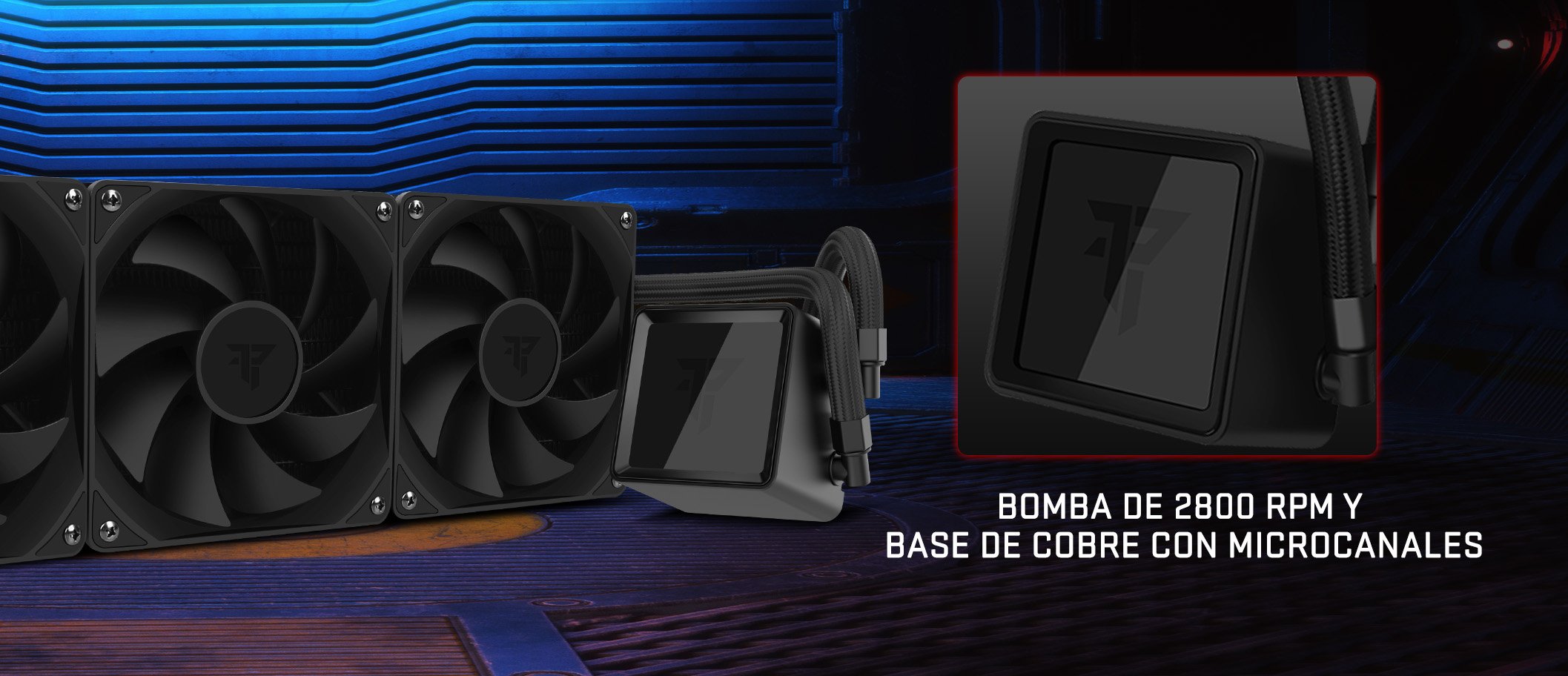 - Su bomba de alto rendimiento a 2800 RPM, combinada con una base de cobre con micro canales de 0.1MM, garantiza una transferencia de calor eficiente y constante incluso en los escenarios más exigentes.