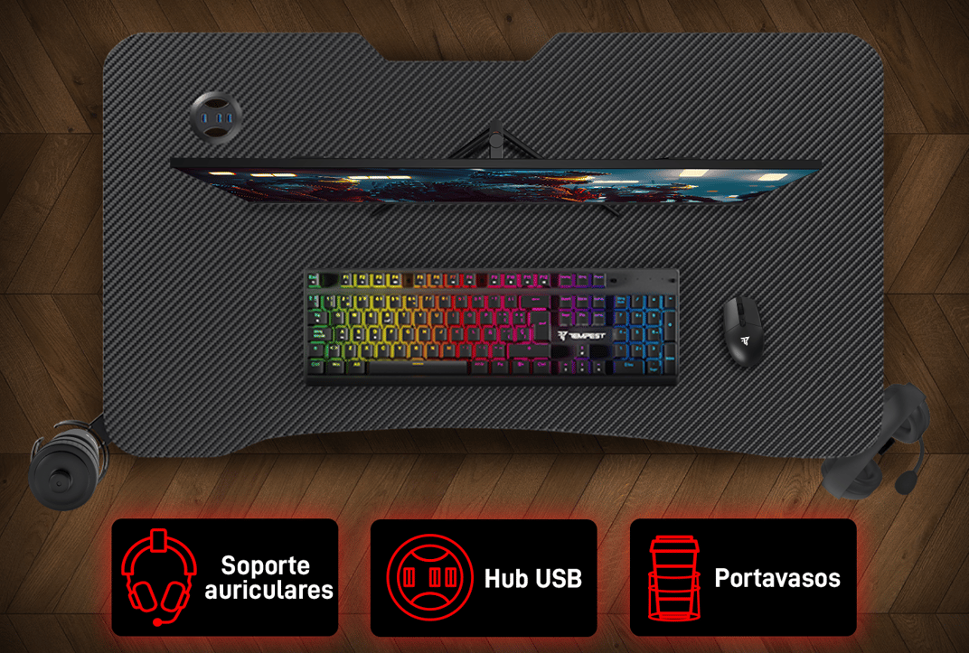Pero eso no es todo, esta mesa viene acompañada de accesorios pensados especialmente para los jugadores. Desde el portavasos para mantener tu bebida a mano hasta el soporte para auriculares para tener todo listo para la próxima partida. El USB hub y el organizador de cables aseguran que todos tus dispositivos estén conectados y organizados, dejándote libre para concentrarte únicamente en la victoria.