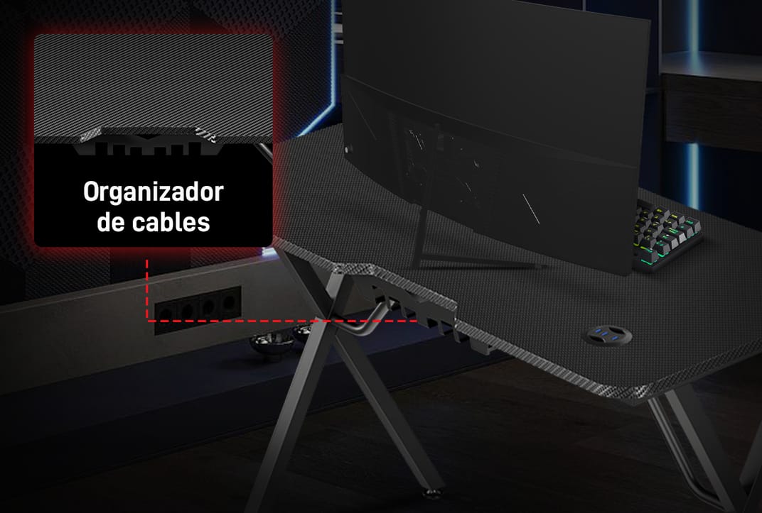 Nuestro organizador de cables mantiene todo conectado, permitiéndote enfocarte solo en ganar. Más que una mesa, es el epicentro de tu experiencia gaming