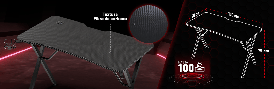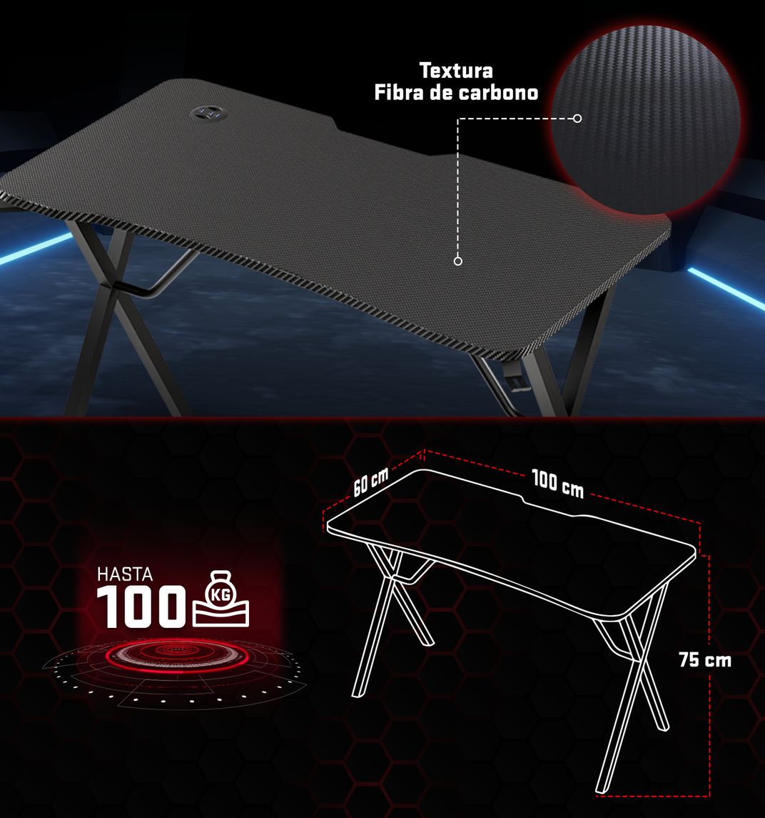 Con unas medidas de 75 cm de alto, 100 cm de largo y 60 cm de ancho, esta mesa ofrece un entorno ergonómico y espacioso, proporcionándote el espacio perfecto para sumergirte en tus juegos favoritos. Las luces RGB integradas son la guinda del pastel, creando una atmósfera envolvente que te transporta al corazón de la acción.