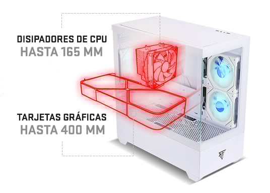 - Soporte para disipadores de CPU de hasta 165 mm y tarjetas gráficas de hasta 400 mm