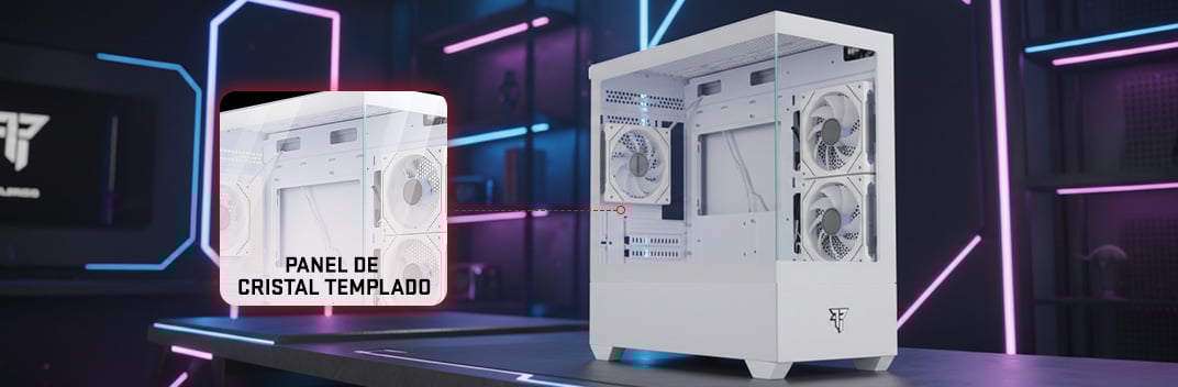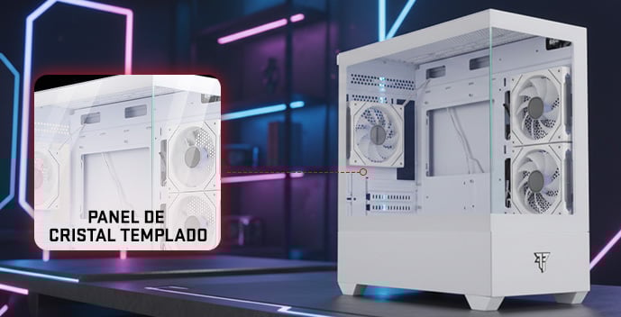 Doble panel de cristal templado ideal para setups gaming, mostrando el interior del equipo y potenciando la iluminación para una estética impactante