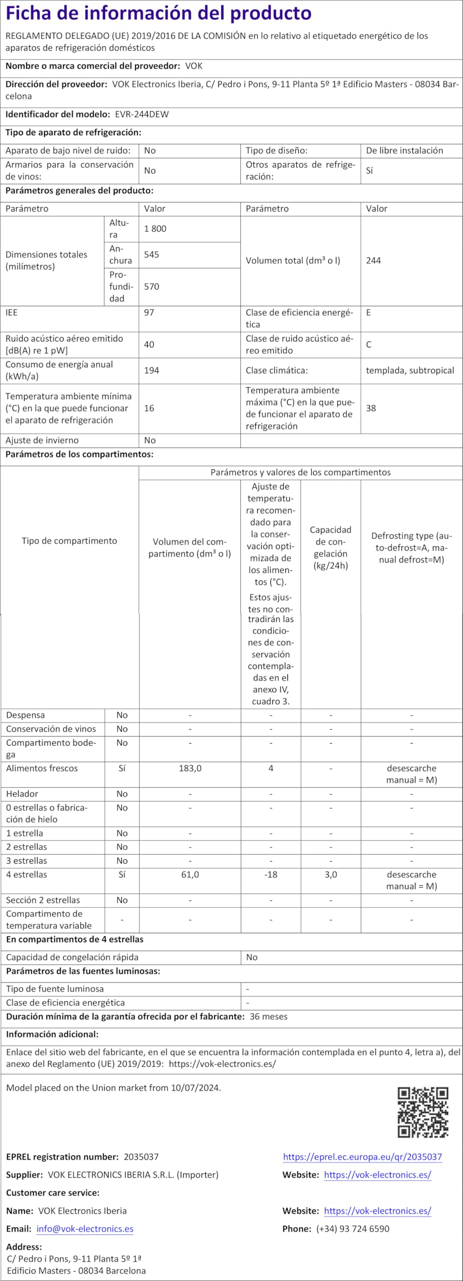 Especificaciones Frigorífico VOK Combi 244L Clase E