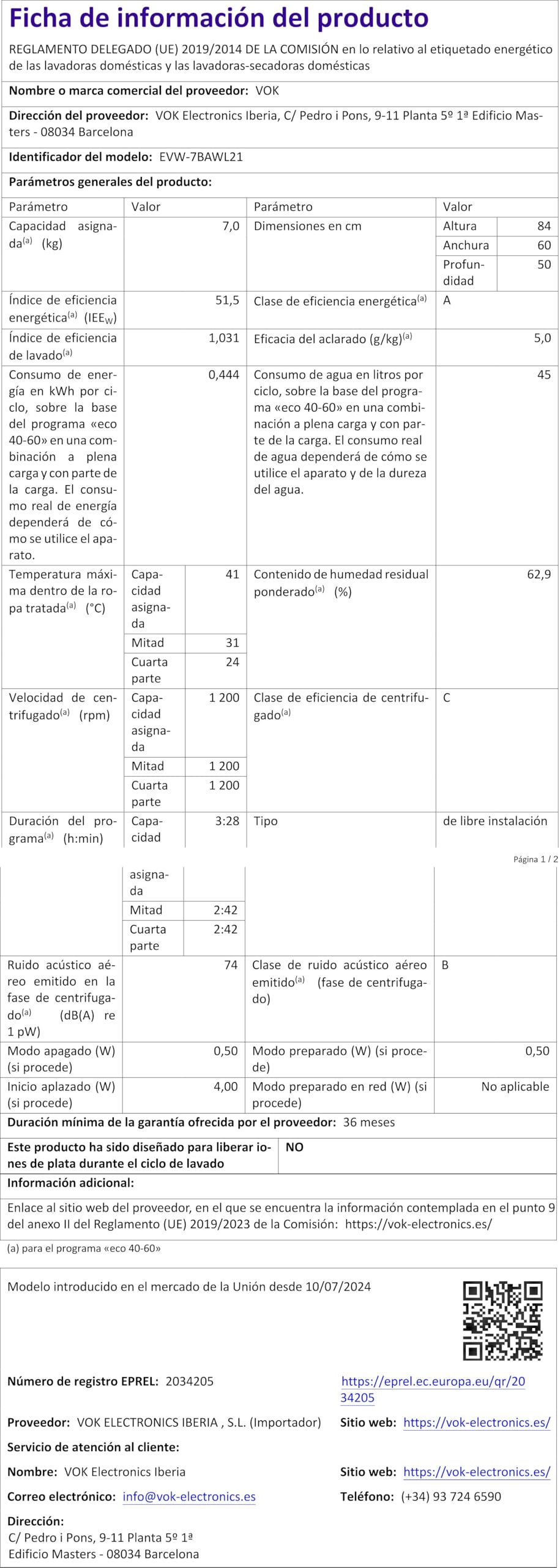 Optimiza tu colada con la Lavadora VOK EVW-7BAWL21N: eficiencia energética A, resultados impecables y funciones inteligentes para hogares exigentes.