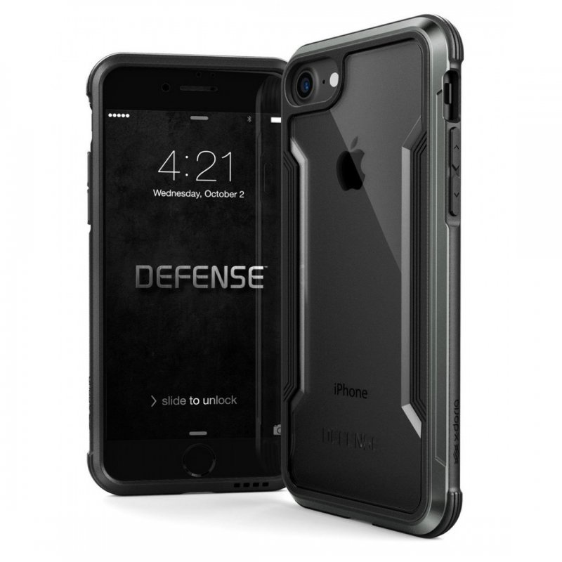 Funda Defense Shield de X-Doria para Apple iPhone 8/SE 2020, la parte trasera es transparente y los bordes de color negro. La funda Defense Shield combina el policarbonato duro, el caucho suave y el aluminio anodizado para componer la mejor protección para su teléfono.